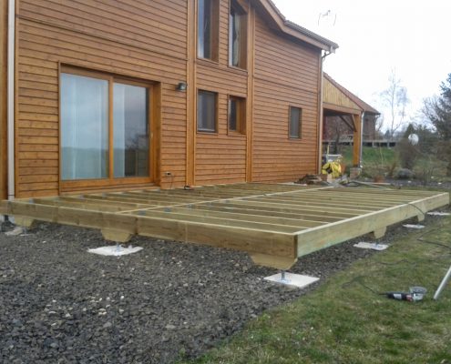 Création d’un auvent mono pente contre ossature bois existante et création d’une terrasse bois